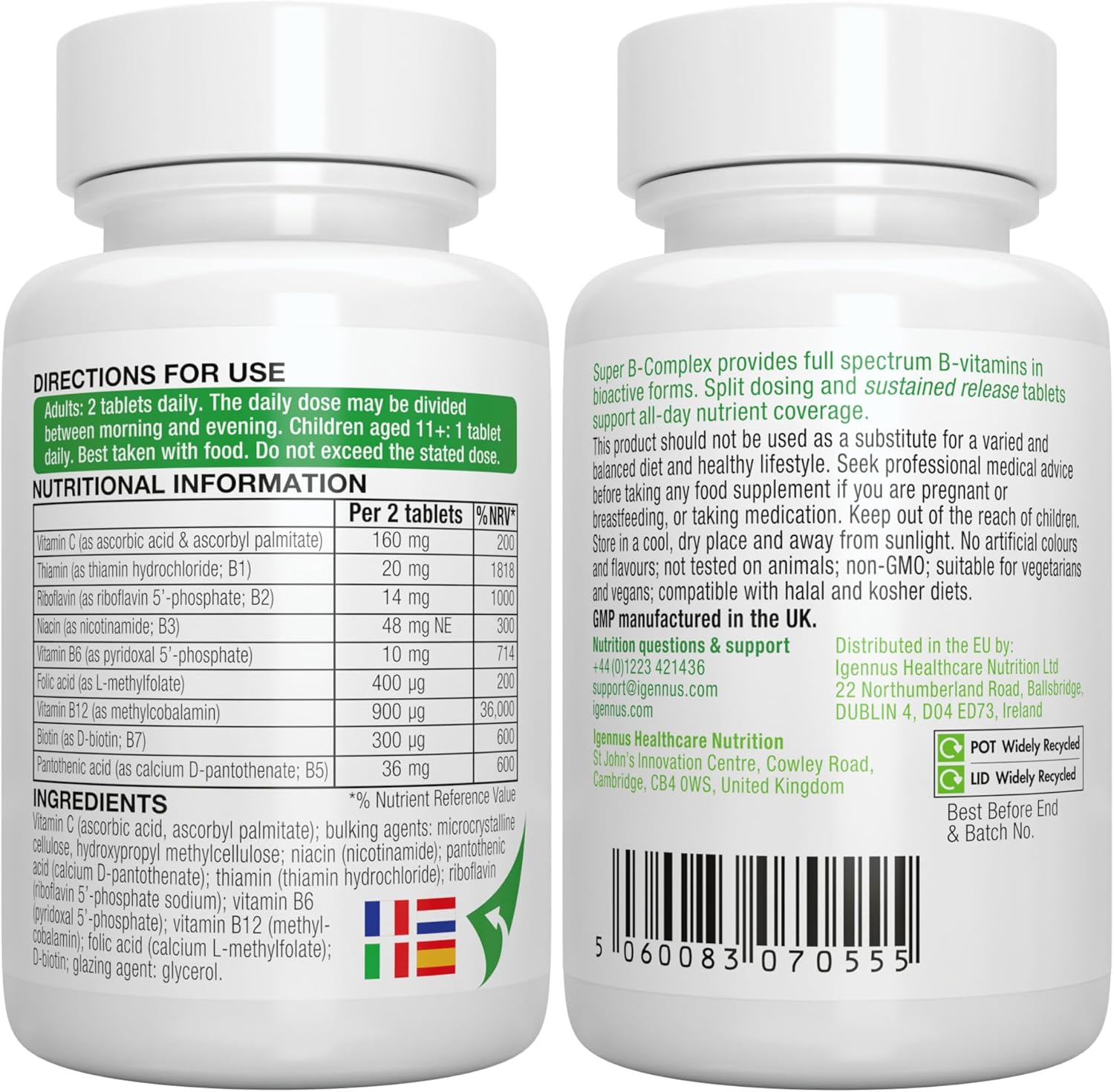 • Dosage Potency: Max Strength / High Potency. All B vitamins are present at levels significantly exceeding the Nutrient Reference Value (NRV) to maximize absorption and ensure effective therapeutic repletion. (Specific NRV percentages should be checked on the product page).
